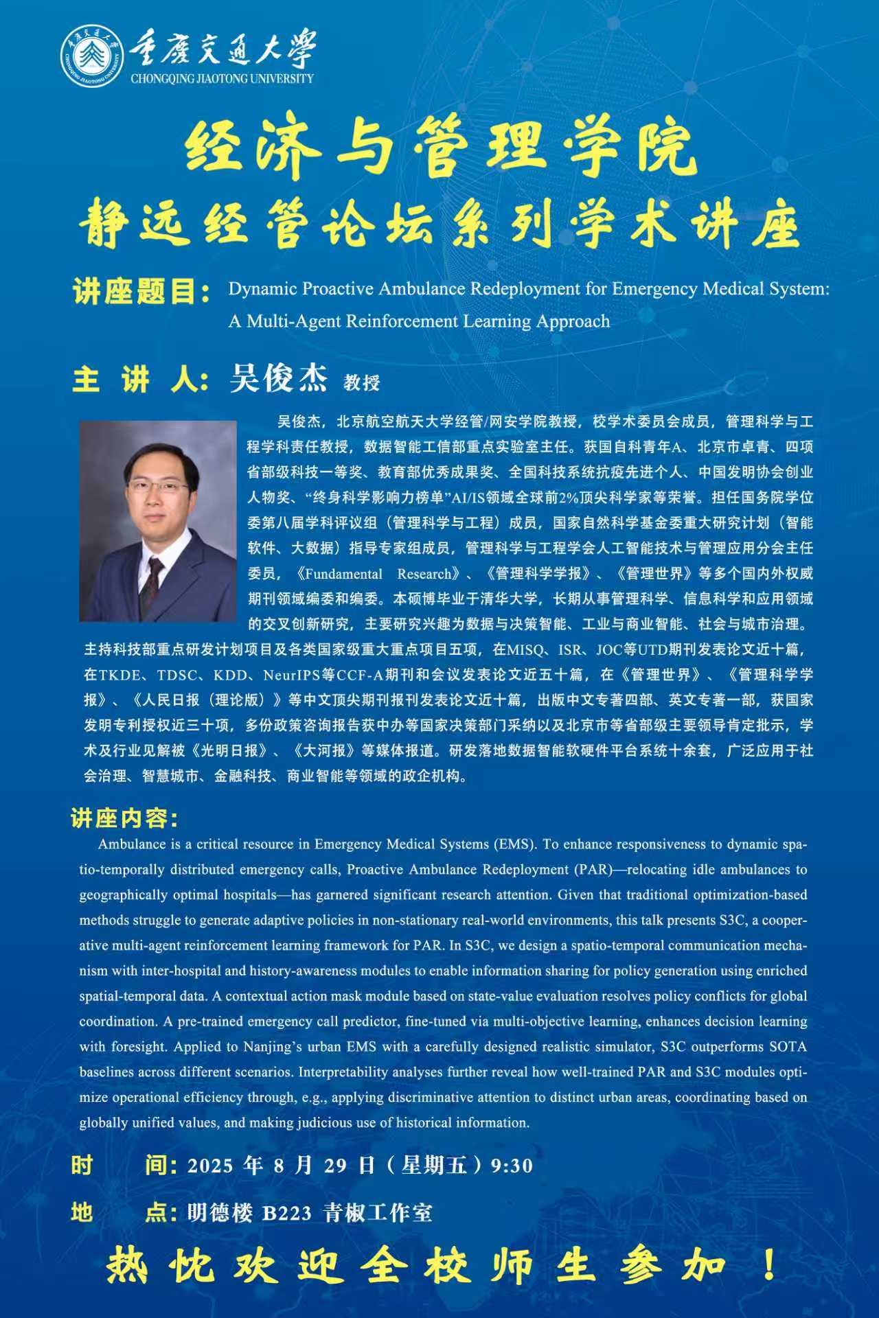 静远经管论坛:Dynamic Proactive Ambulance Redeployment for Emergency Medical System: A Multi-Agent Reinforcement Learning Approach